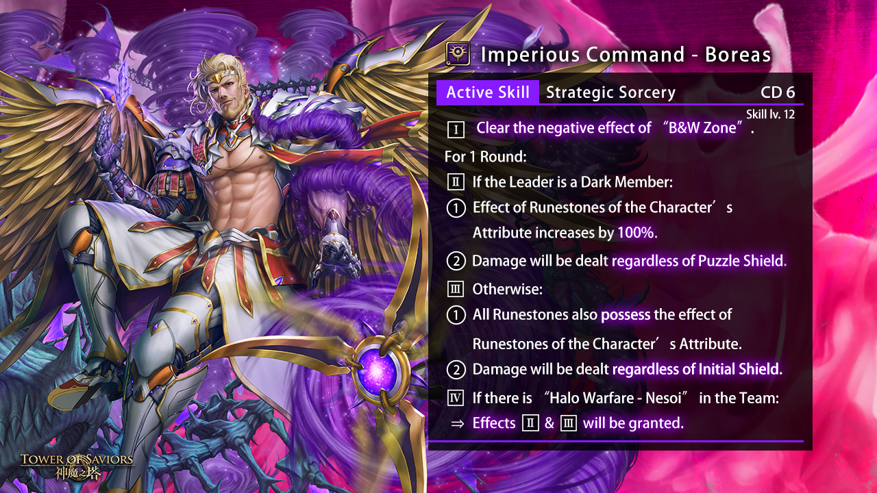 | Both the Leader and Ally are “Halo Warfare – Nesoi” with “Imperious Command – Boreas” in the Team. | ◆ Alter the Attribute of “Imperious Command – Boreas” into Light. |