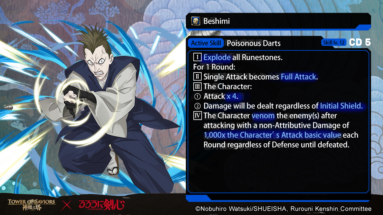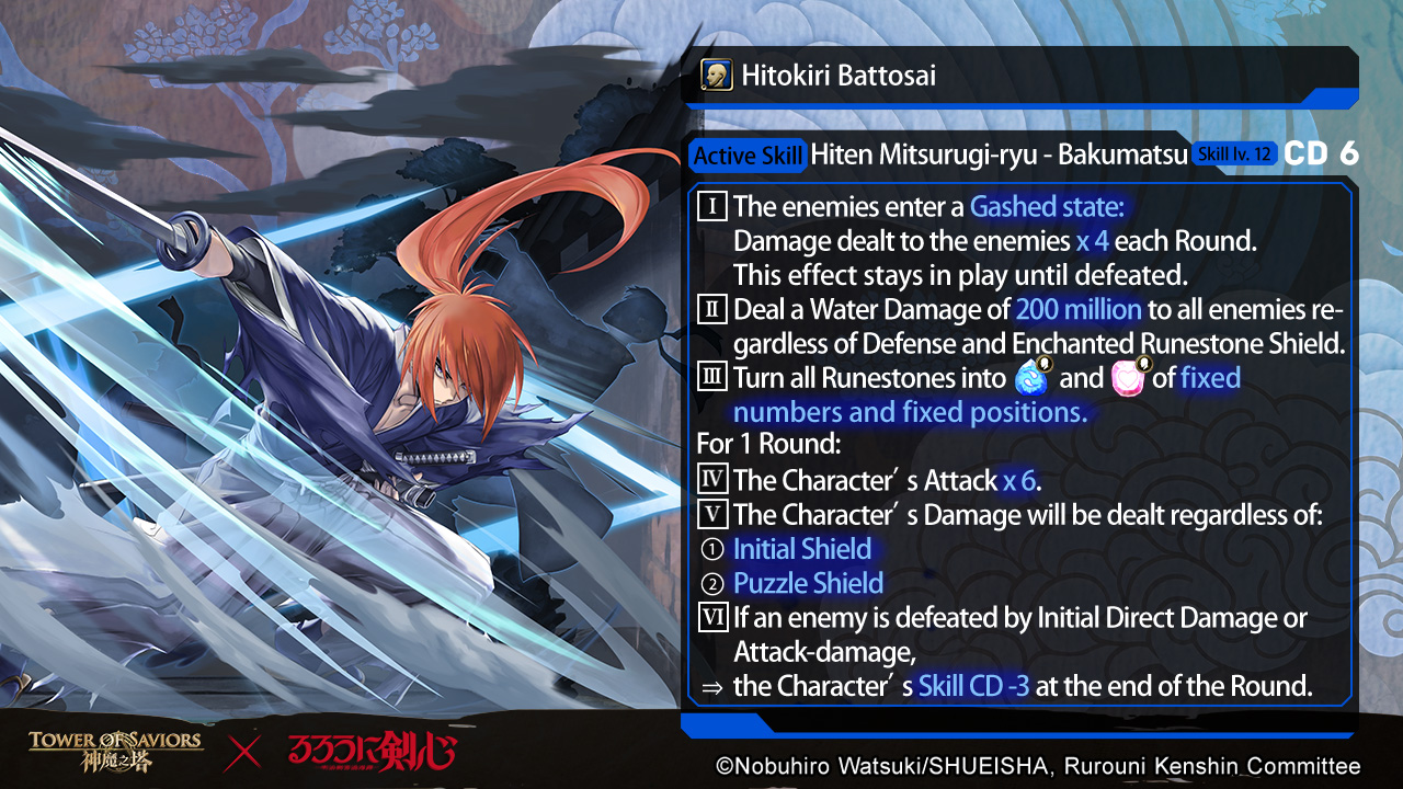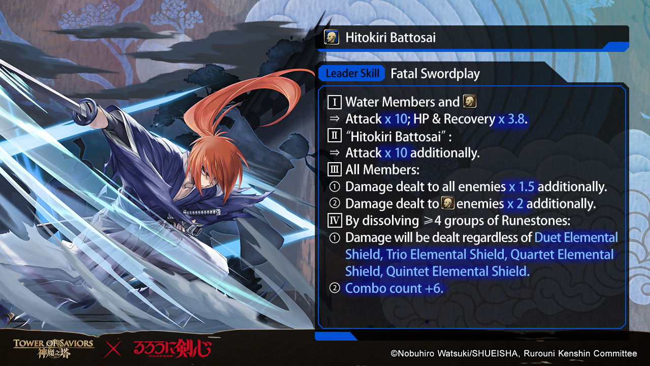 | Both the Leader and Ally are “Hitokiri Battosai”. | ◆ Extend Runestone-moving time regardlessly by 5 seconds. ◆ “Hitokiri Battosai”: ⇒ Skill CD -6 after entering a Stage. ◆ “Sticky”, “Burning” and “Smog” will be nullified. ◆ Runestone movement will not be stopped and Damage can be dealt when a shot position of “Laser Trap” is touched. ◆ All Runestones also possess 150% effect of Water Runestones. ◆ If Runestone movement ends within ≤8 seconds, ⇒ “Hitokiri Battosai”: Attack x 3. ◆ If an enemy is defeated by Initial Direct Damage or Attack-damage: ⓵ Fully recover HP. ⓶ “Hitokiri Battosai”: ⇒ Skill CD -1. ◆ When the Character Runestone of “Hitokiri Battosai” is triggered, ⇒ that “Hitokiri Battosai” enters a hyper state for 1 Round. ◆ By starting Runestone movement with a Character Runestone: ⓵ Turn the Water, Fire and Earth Runestones touched while moving into Enchanted Water Human Runestones. ⓶ Turn the Light, Dark and Heart Runestones touched while moving into Enchanted Heart Human Runestones. ◆ Dodge the first attack of each enemy. ◆ By dissolving only 2 types of Runestones in the first batch, ⇒ the Damage received in the Round will not lead to your defeat. ◆ Upon the Skill activation of “Hitokiri Battosai”: ⇒ Damage will be dealt regardless of ⓵ Cross-shaped Shield ⓶ Fixed Combo Shield |