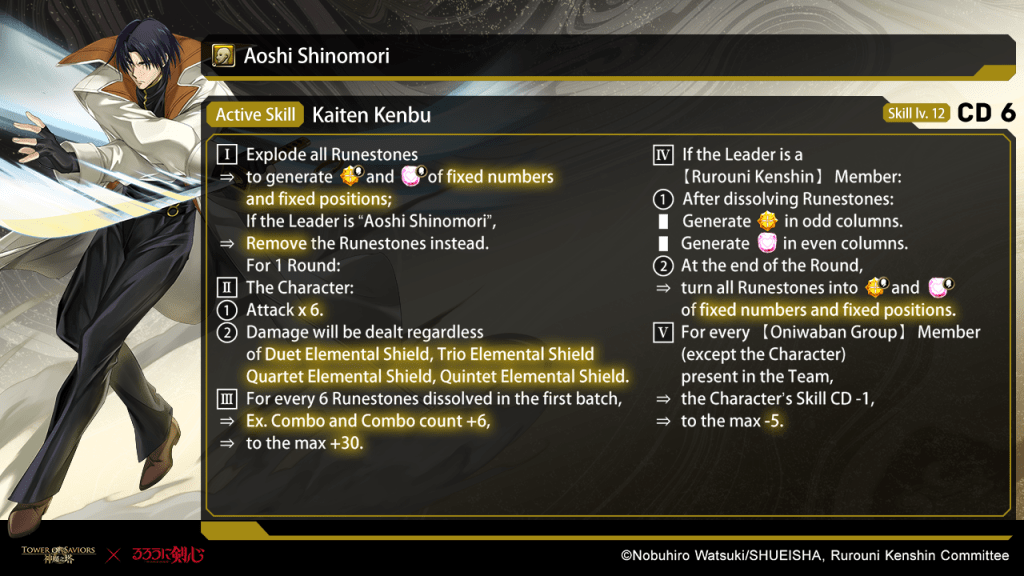 | Aoshi Shinomori | Own Dual Max Shikijo | By dissolving the Character’s Character Runestone in the first batch, ⇒ the Character launches 1 extra attack as much as 100% of its Attack. |