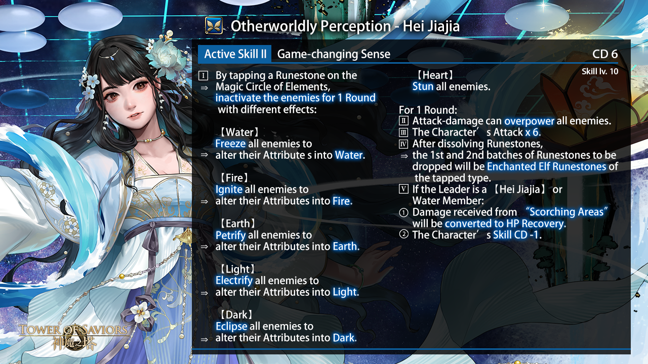 | The Leader is “Otherworldly Perception – Hei Jiajia” and the Ally is an Elf, Water or 【Hei Jiajia】 Member. | ◆ Acquire “Undivided Attention” ability: ▋Unlimited Runestone movement without dissolving in 15 seconds. ⇒ Turn the Runestones touched while moving into Enchanted Runestones of the type that is used to start each Runestone movement. (This will not be counted as 1 Round.) ◆ This ability can be activated at the beginning of the Round by tapping the fully charged Craft Apparatus at the expense of 100% of the power gathered. |