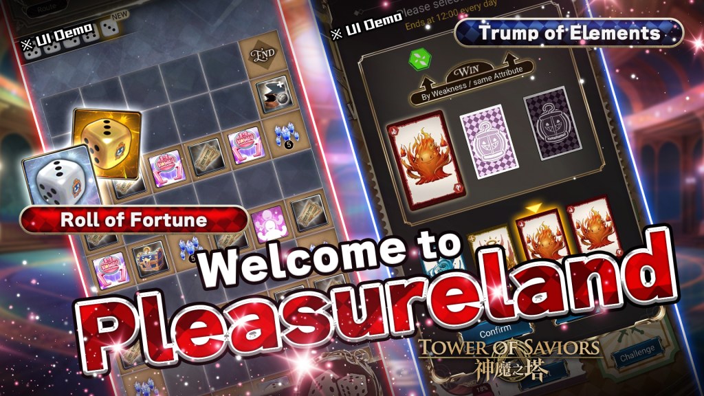 | ★ 2nd Event: New Event “Welcome to Pleasureland” Time: 7 Oct (Mon) after maintenance to 3 Nov (Sun) 23:59 A brand new event is here! Come and play the two new minigames, Trump of Elements and Roll of Fortune! 1st Minigame【Trump of Elements】 ※ Summoners will have a chance to play this minigame by consuming a certain amount of Stamina during the event. ※ There are 5 types of Madhead Cards, each representing an Attribute. ※ Each time a Summoner plays the minigame, they must choose one Madhead Card from 4 random cards as their trump card to play against the game developers. ※ Each Summoner can get up to 3 chances each day. * All chances must be used before 23:59 in the day. No cards can be played after the deadline. The developers’ pick will be revealed the next day at noon and rewards will be given to Summoners based on the result. ※ A Summoner can win the game in two scenarios: ※ Their card prevails over the Attribute of the developers’ card; or ※ Their card matches the Attribute of the developers’ card. * Throughout this event, the developers will contend with a deck of 25 Madhead Cards, featuring 5 cards of each Attribute. The developers’ card deck will diminish daily as a card is revealed. Summoners, on the other hand, will play with an inexhaustible deck of Madhead Cards. 2nd Minigame【Roll of Fortune】 Win fruitful rewards by helping Shroy reach his destination! Upon accomplishing various missions, Summoners will acquire 2 kinds of dice, white and golden. The white dice are the default dice; the golden dice, on the other hand, are special dice that enable Summoners to decide the outcome of the dice roll. Based on the outcome of each dice roll, Shroy will progress on the board advancing toward the ultimate goal. The minigame comprises three distinct routes, each offering certain rewards. Summoners will receive specific rewards after they complete a route for the first time. However, the squares in the route will reset when Summoners re-enter. White Dice will be given instead if certain rewards have been obtained. Summoners can collect as many rewards as possible by using the special items scattered across the board. Furthermore, Summoners may also gather Summon Quartz along their journey. By gathering a certain number of Summon Quartz along the route, Summoners will receive the event-exclusive character “Roll of Dice – Toby” (Skill Lv.1) x1. Those who complete all routes will be rewarded with “Roll of Dice – Toby” (DUAL MAX) x1. Rewards in each route: ※ Special items ※ “Lucky Dice” Redemption Coupons (Dragonware for “Island of Revelry” Members) ※ “Detective Glass” Redemption Coupons (Dragonware for “Extrinsic Detectives” (series) Member) * The “Extrinsic Detectives” series characters will be introduced to the game next week. ※ Summon Quartz How to get Dice: ※ Log in for the first time during the event period – White Dice x 3 ※ Play the【Trump of Elements】 minigame – up to Dice (White and Golden) x3 each day ※ Win the【Trump of Elements】 minigame cumulatively. ※ Complete a route for the first time. ※ Rechallenge a completed route. ※ Passing a number of squares on the board. ※ Purchase with Coins or Diamonds in the Shop. ※ Challenge event stages for several times. ※ Challenge the Pleasureland Special Stage weekly. * Rewards and progress of each route can be found in the 【Details】 section. * Summoners may purchase the following items with Diamonds in the Pleasureland Shop: ※ White Dice 【No purchase limit】 ※ Special items 【Purchase limit: 3 per each item】 └ Grappling Hook └ Replication Tool └ Claw Crane └ Golden Dice * The last 【Trump of Elements】 game result will be announcd on 28 Oct (Mon) at noon. * The event stages will be closed after 27 Oct (Sun) 23:59 but Summoners may continue to play the 【Roll of Fortune】 minigame until 3 Nov (Sun) 23:59. |