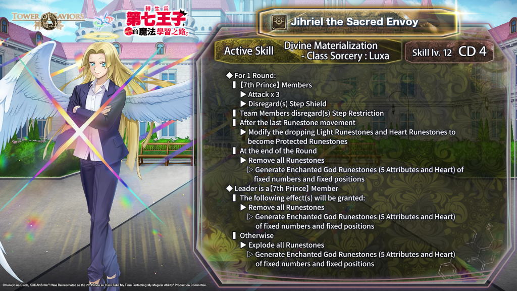 | Jihriel the Sacred Envoy | Own Saria the Fourth Princess | By dissolving the Character’s Character Runestone in the first batch, ⇒ the Character launches 1 extra attack as much as 100% of its Attack. |